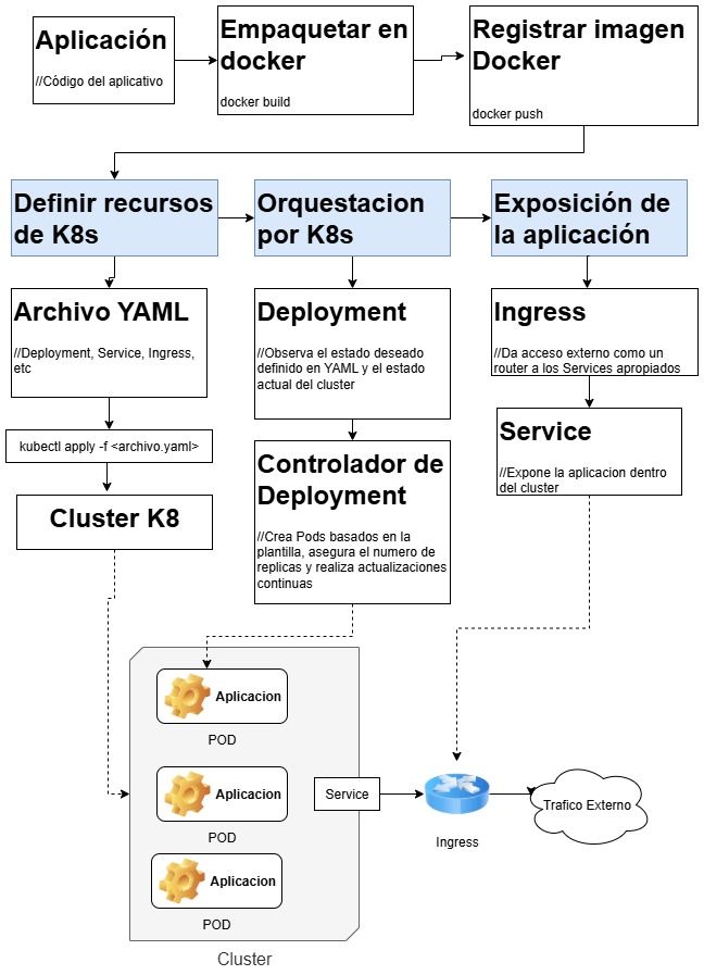 -Kubernetes orquesta el despliegue de la aplicación, creando pods y gestionando replicas.