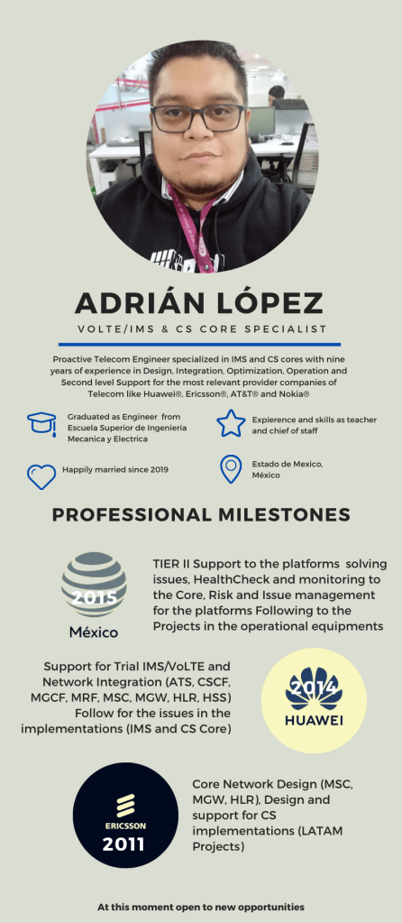 My work expierence begins some years ago as personnel chief in a little maintenance company where I was in charge for 15 employees aproximately, after that I was give training in a high school level about knowledge realted to my carrer (math, physics, programation and computation. About Voice Networks I was work in Ericsson as Network Engineer, after that I worked in Huawei as Integration Engineer and the last years I give my knowledge to AT&T Mexico where I work with different providers like Nokia, Huawei, Ericsson and Motorola as TIER II Support Engineer.